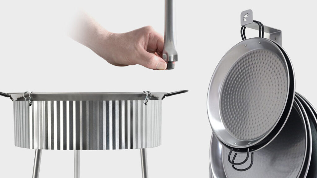 Desde soportes y patas regulables hasta trípodes reforzados capaces de sostener grandes paelleras con seguridad, cada accesorio está diseñado para adaptarse a diferentes necesidades y contextos.